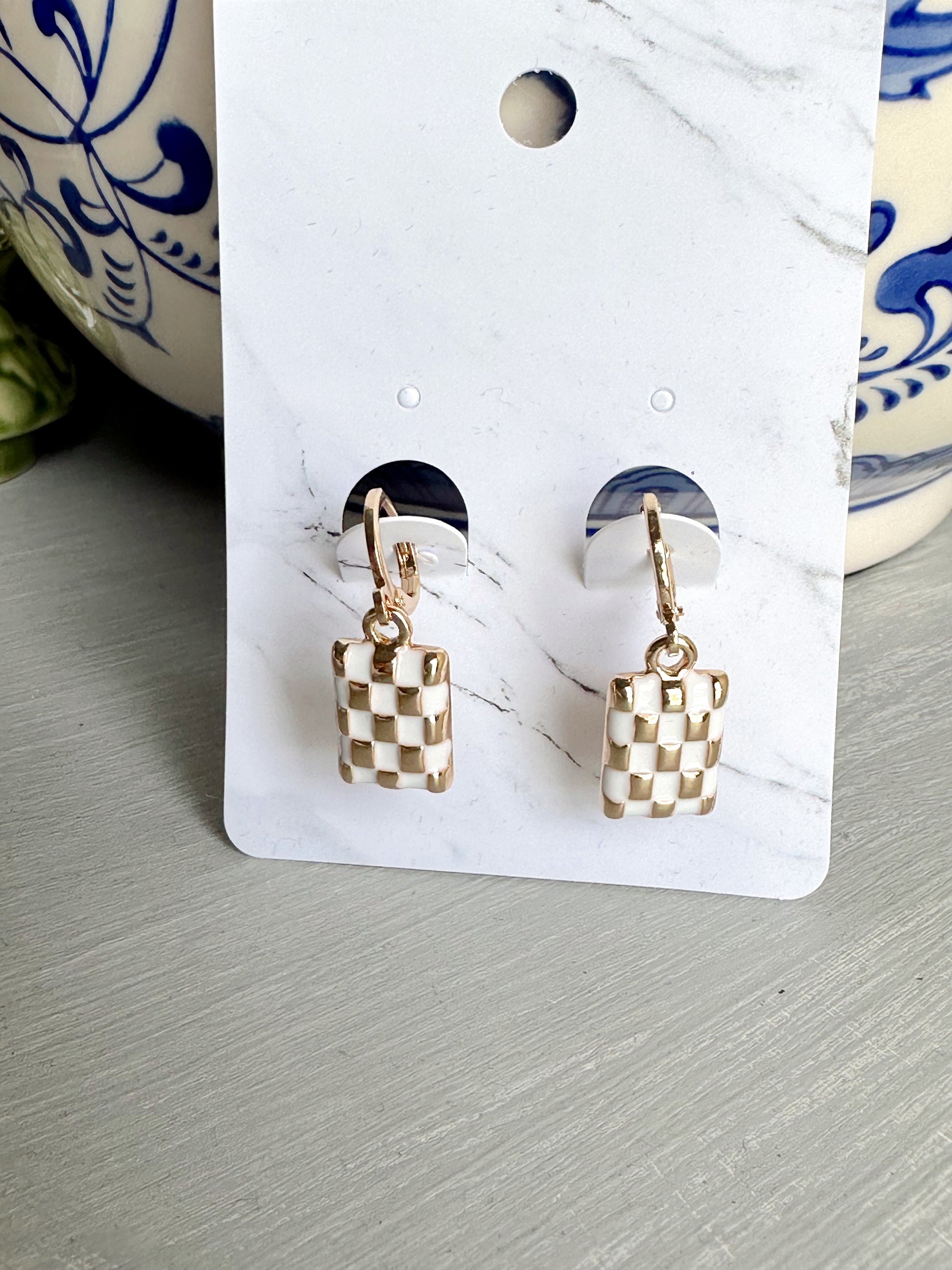 These Checker Rectangle Drop Earrings make a bold statement. Crafted of enamel colors on a brass huggie hoop with a gold plating for added shine, they take any look to the next level. Make a statement with these stunning earrings!
