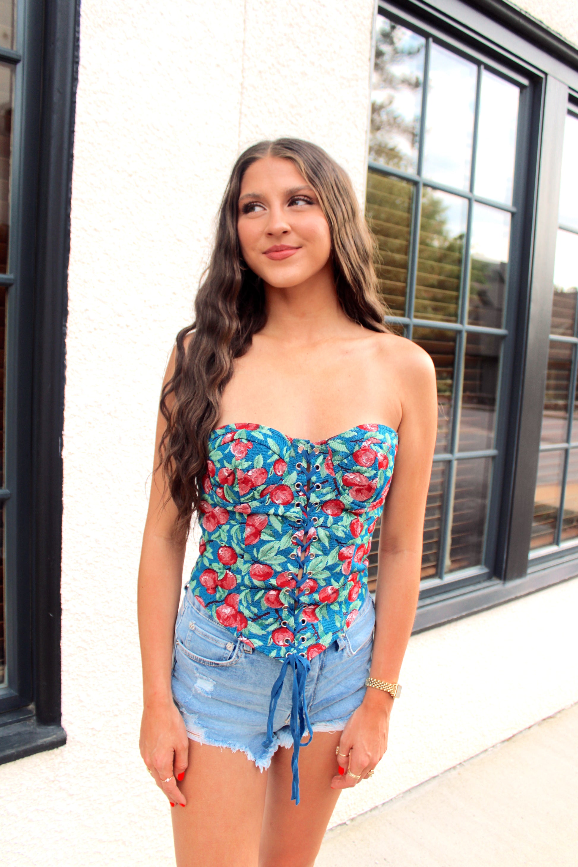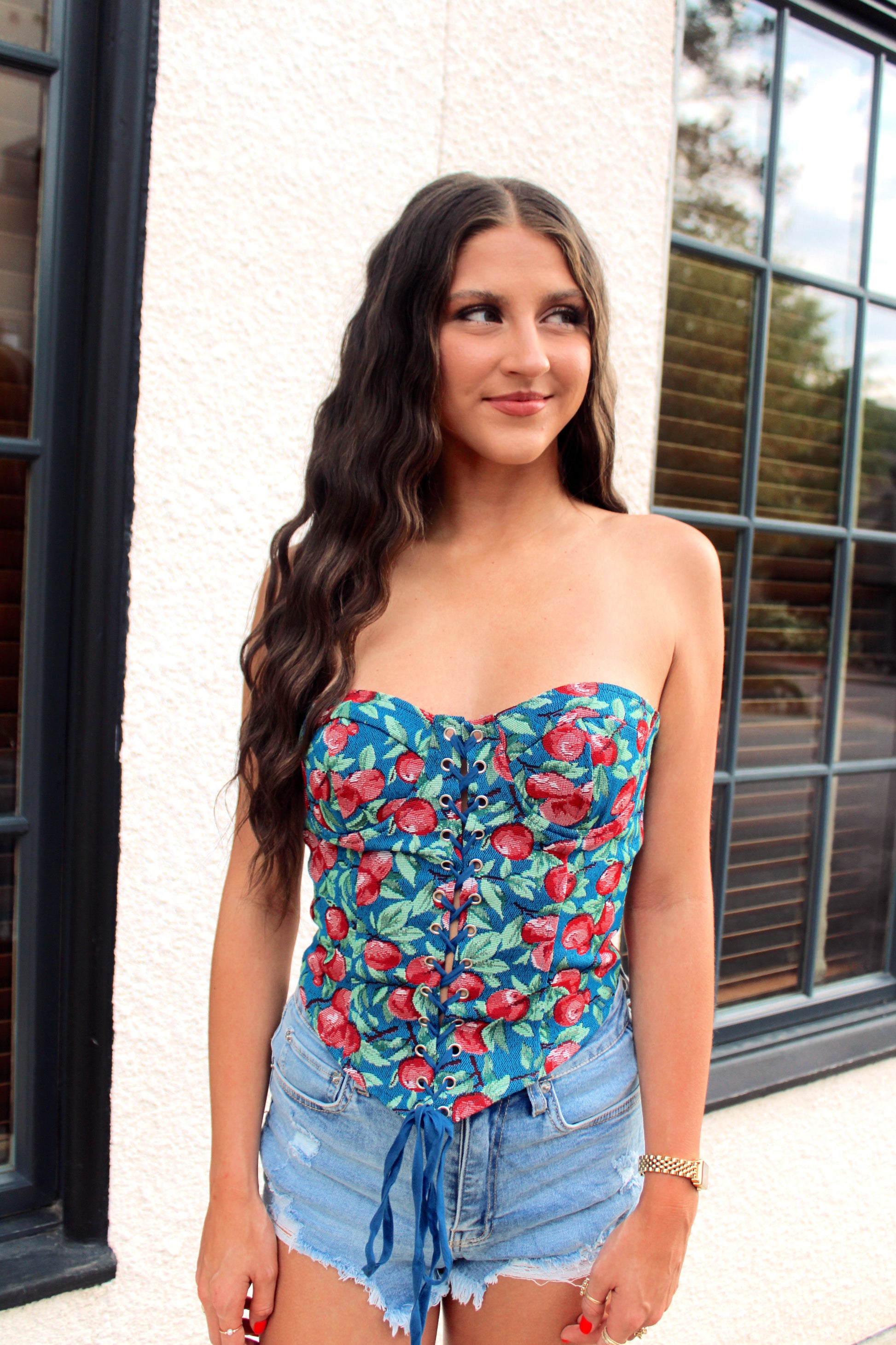 Our Cherry Gloss Corset is the perfect choice for a night out! It offers a zippered back along with a stylish tie detail in front, making it a show-stopping top! The model is wearing a size small!