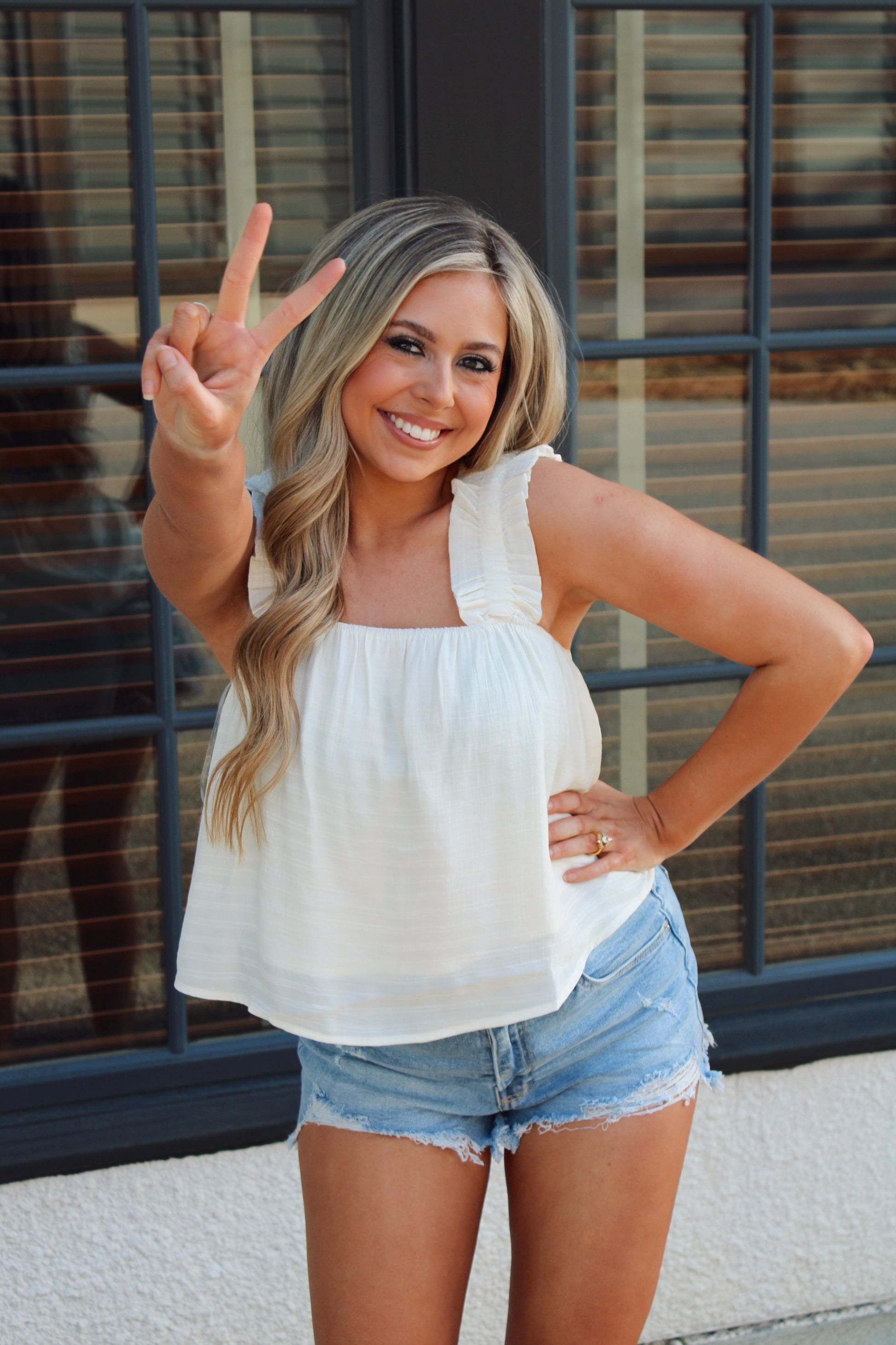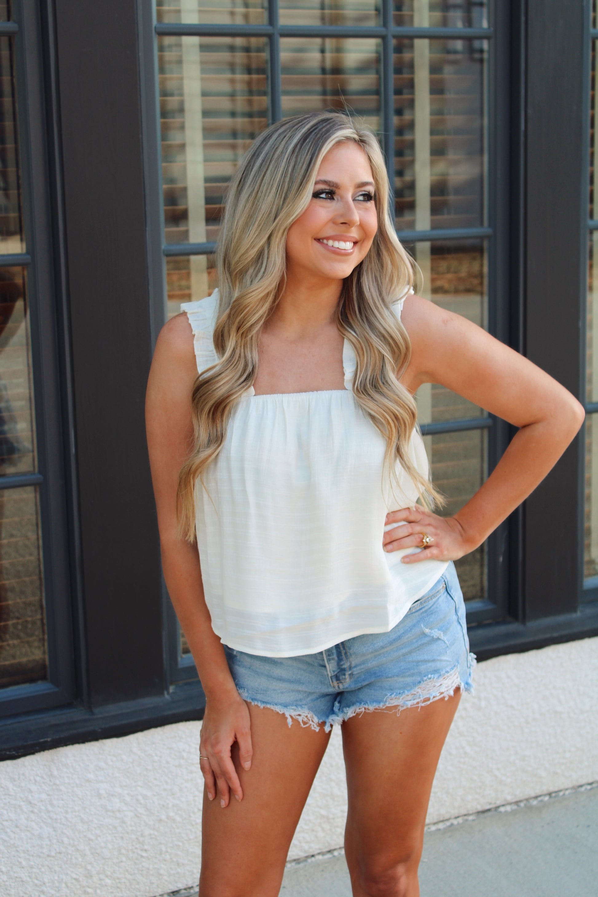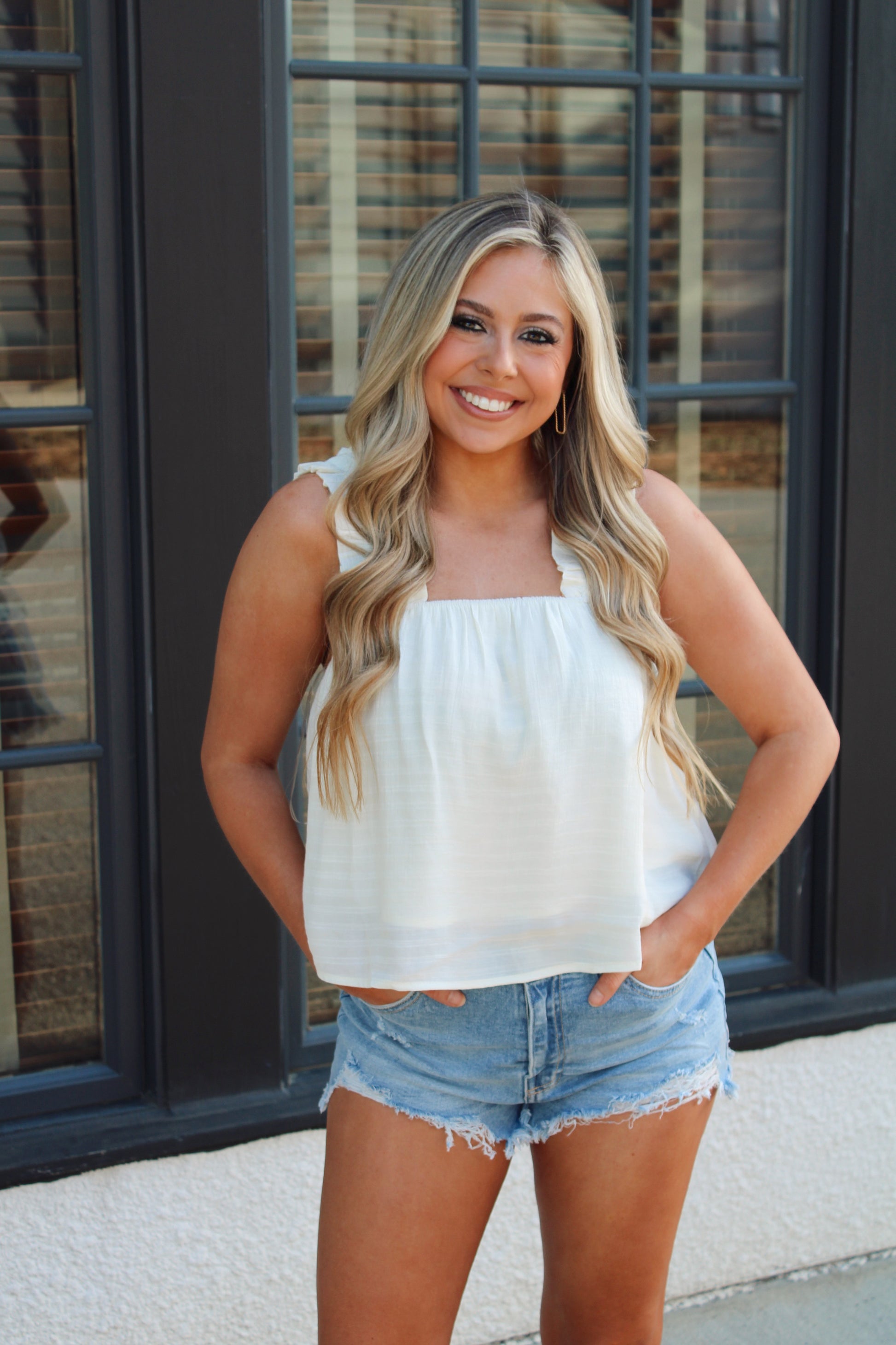 The perfect cute & casual top! Our Lila Top is a flowy cami featuring ruffled detail straps. Perfect to pair with shorts! Its not too long but also not a crop top :)