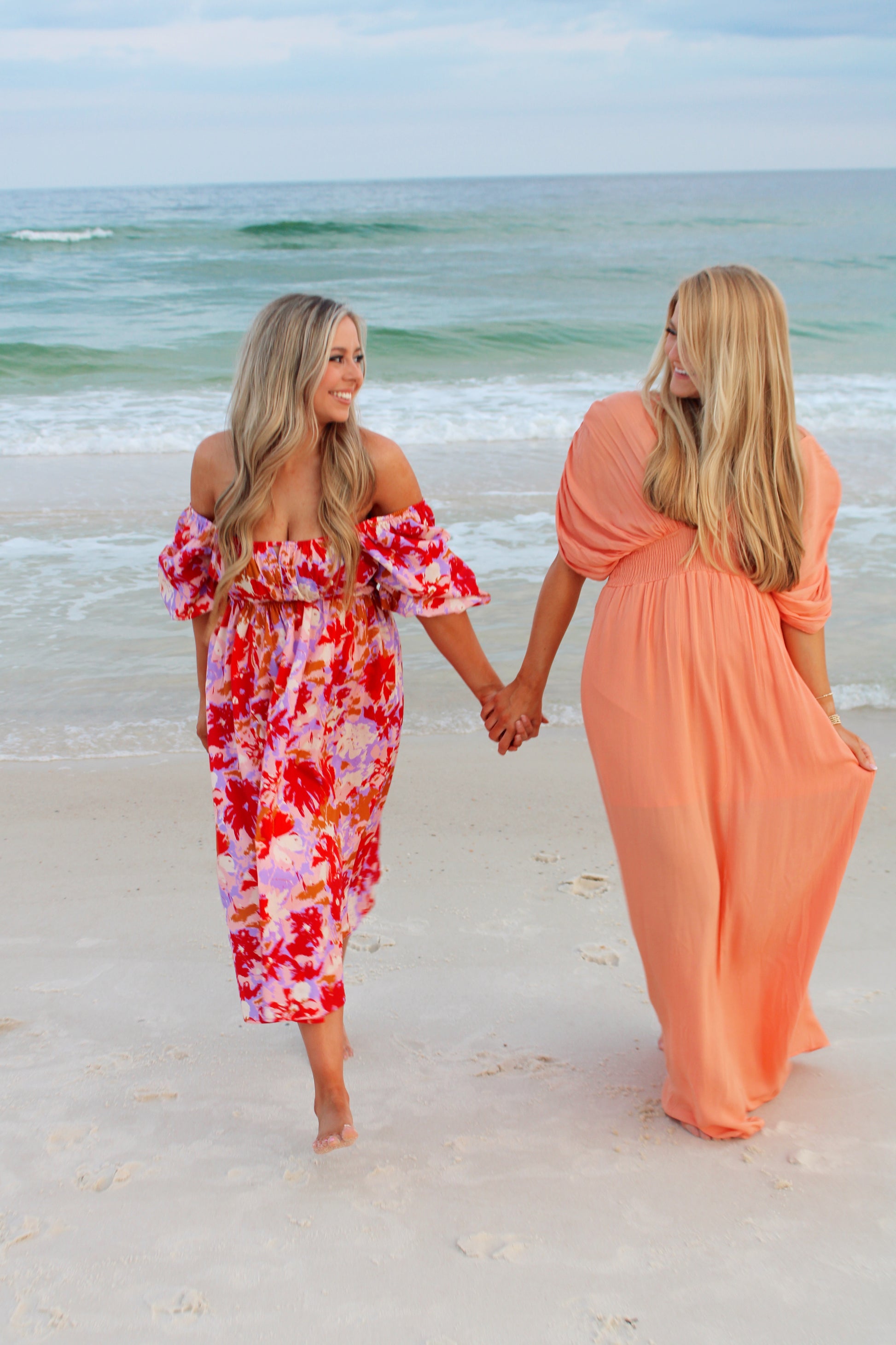 Feel the summer breeze with this lightweight, fun and flirty maxi sundress! Featuring a bright peachy hue, short sleeves, v-neckline, smocked waist and back self-tie detail, you'll be ready to put on your sunnies and soak up the sun! Perfect for a beach getaway or a summer vacation!